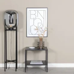 Golvlampa i svart metall med detaljer i brunt konstläder och matt mässing.