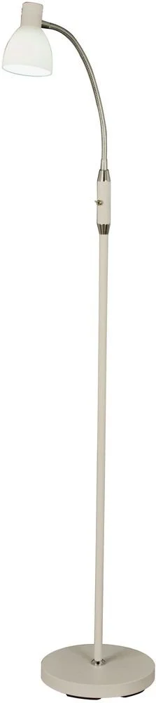Golvlampa i vit och kromad metall. Vridbar hals, strömbrytare på stommen.