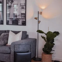 Golvlampa i svart metall och matt mässings utförande. Tre vridbara ljuskällor.