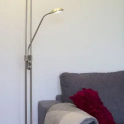 Golvlampa i svart metall med detaljer i krom. Två vridbara lamphuvuden med separata strömbrytare på stommen.