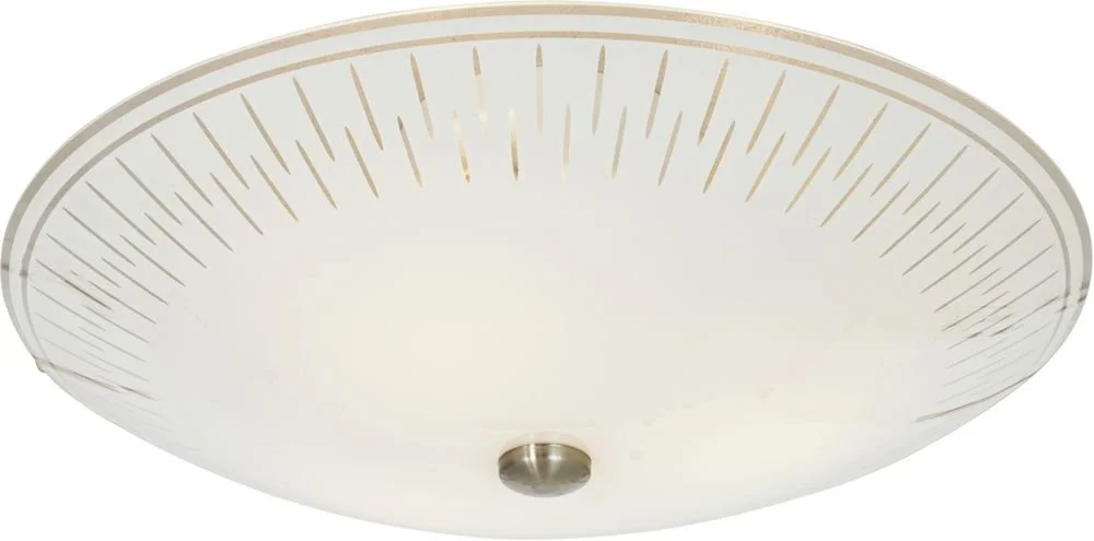 Taklampa i metall och vitt glas med mönster. Monteras lätt i taket.