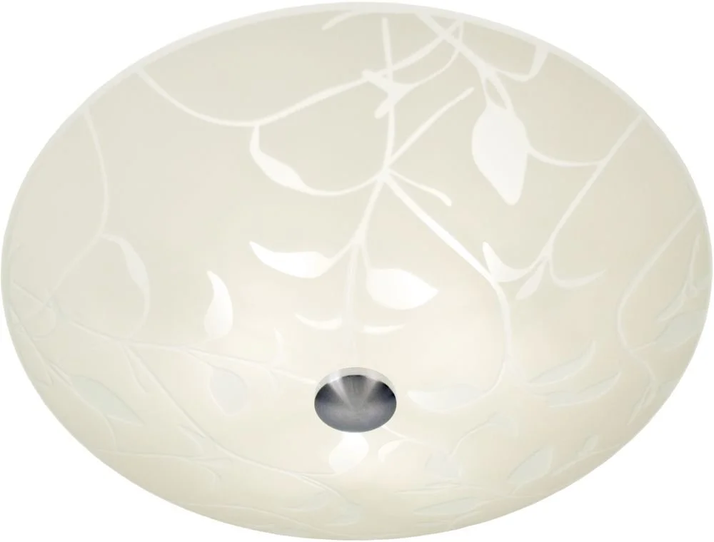 Taklampa i metall och vitt glas med mönster. Monteras lätt i taket.