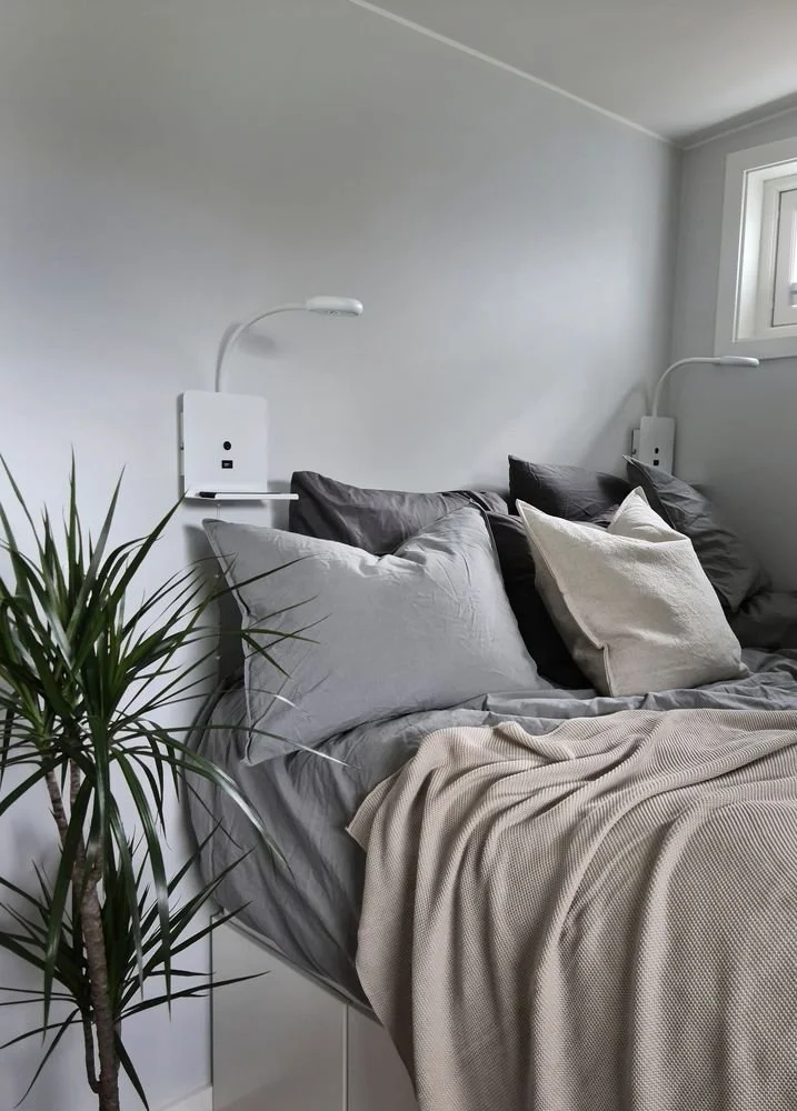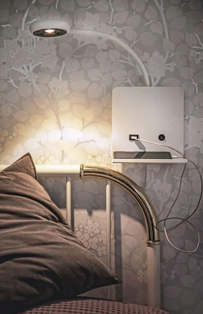Sänglampa i vitt utförande. Monteras lätt fast i väggen. USB uttag och hyllplan för laddning av enheter.