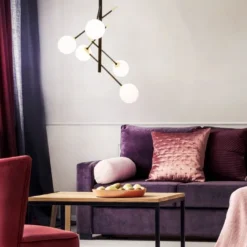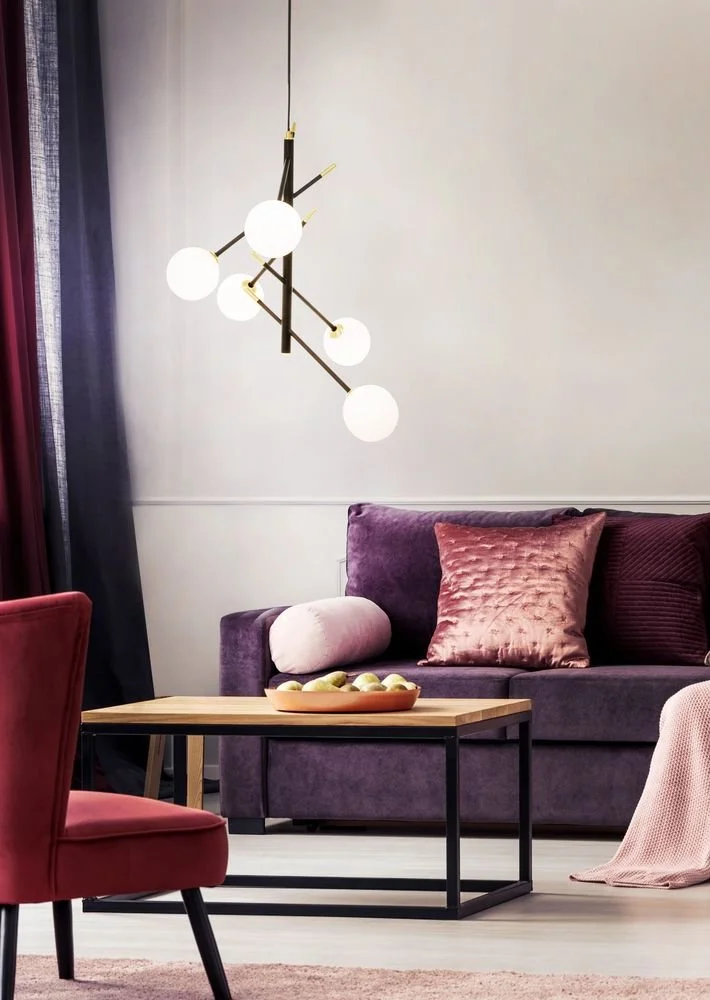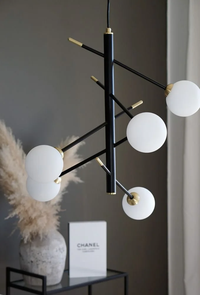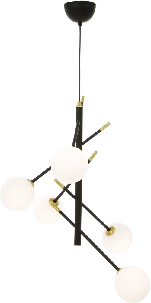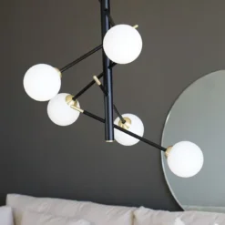 Taklampa i svart metall med detaljer i matt mässing. Glaskupor i opalvit. Lätt upphängning i taket.