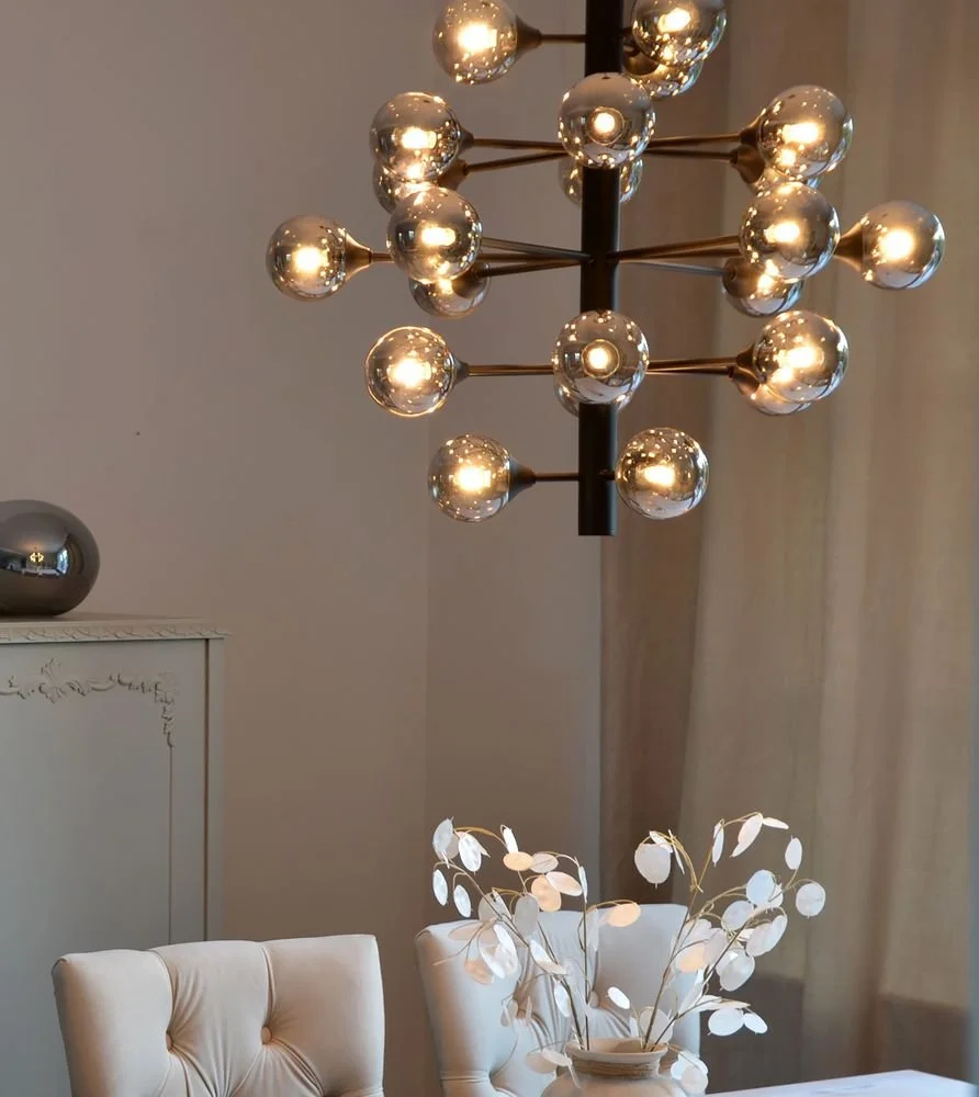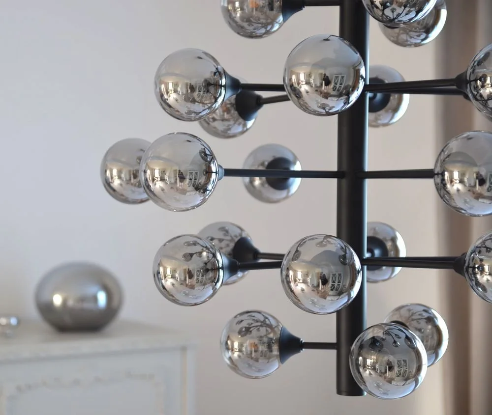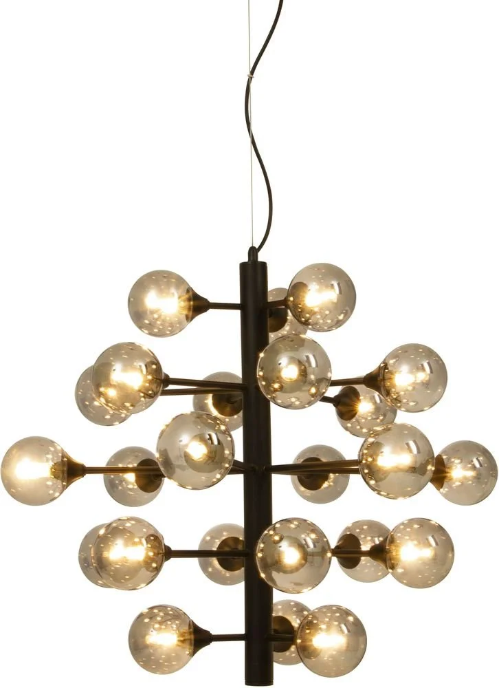Taklampa i svart metall med glaskupor i rökgrått. Lätt upphängning i taket.