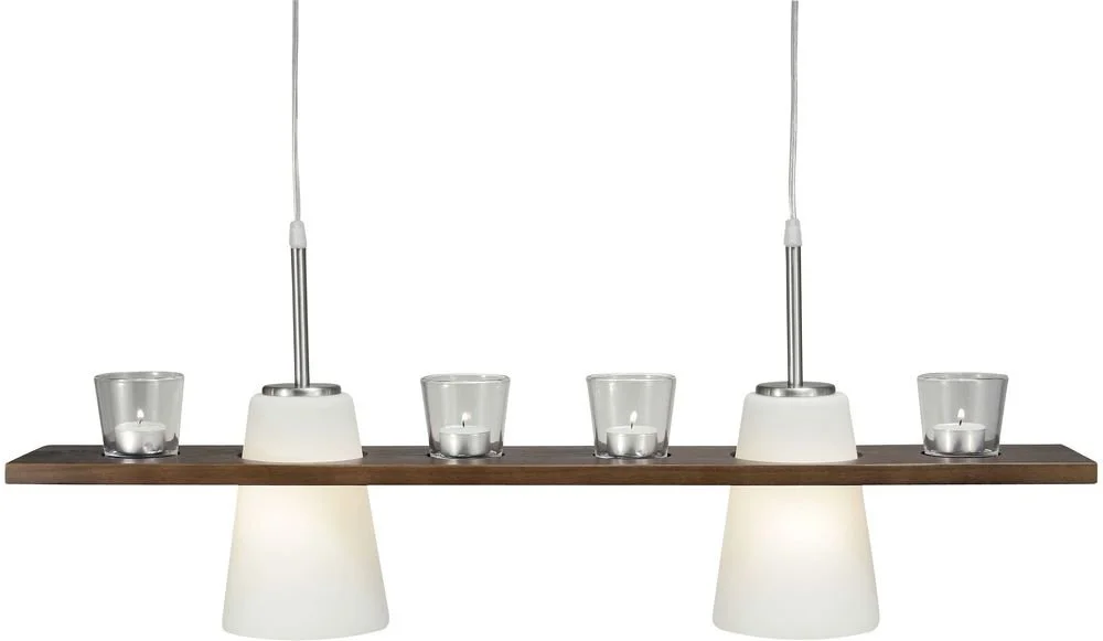Taklampa i trä med opal och klarglas. Två lampor och 4 hållare för stearinljus. Obs! Lämna aldrig levande lågor utan uppsikt.