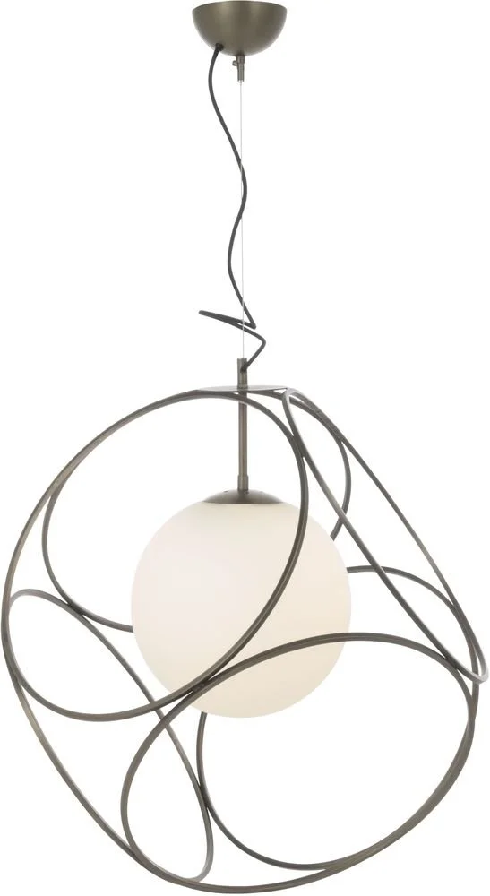 Taklampa i metall med tenn utförande och vitt glas. Lätt upphängning i taket.