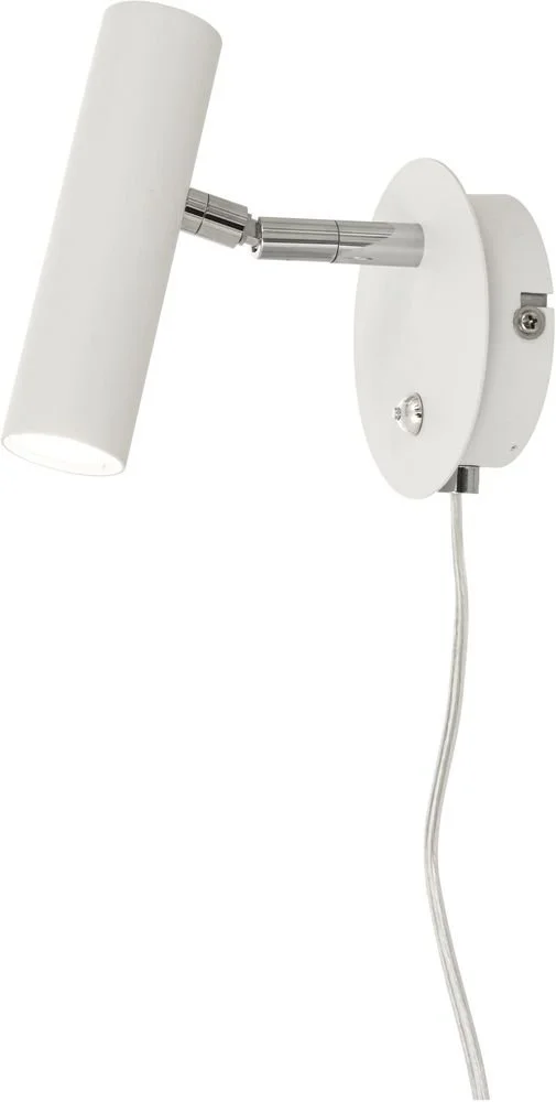 Vägglampa i vitt och krom utförande. Monteras lätt fast på väggen. Strömbrytare på lampan.