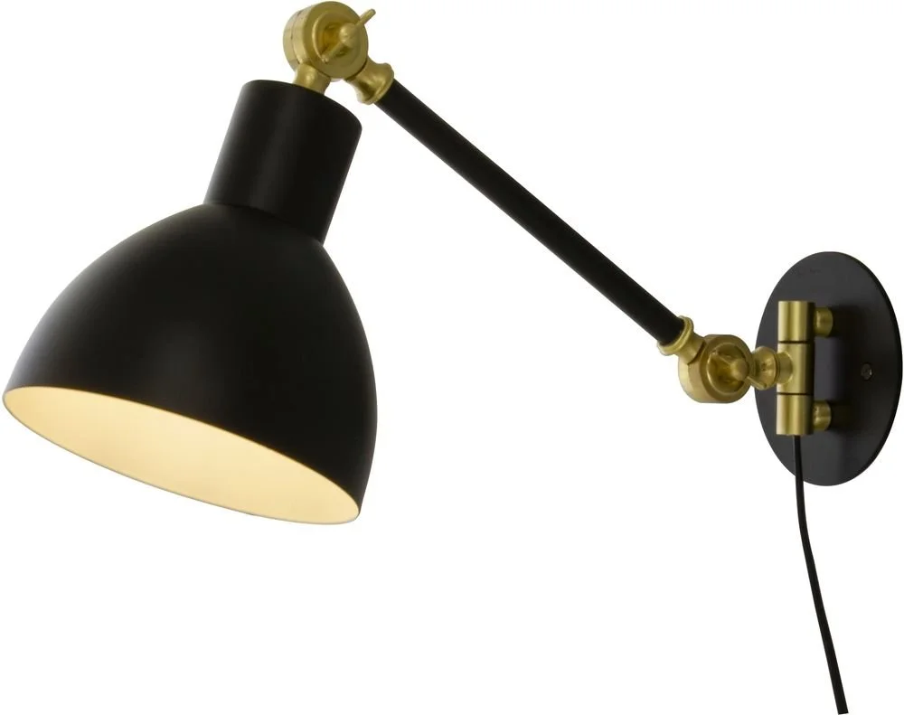 Vägglampa i svart metall med mässingsfärgade detaljer. Monteras lätt på väggen.