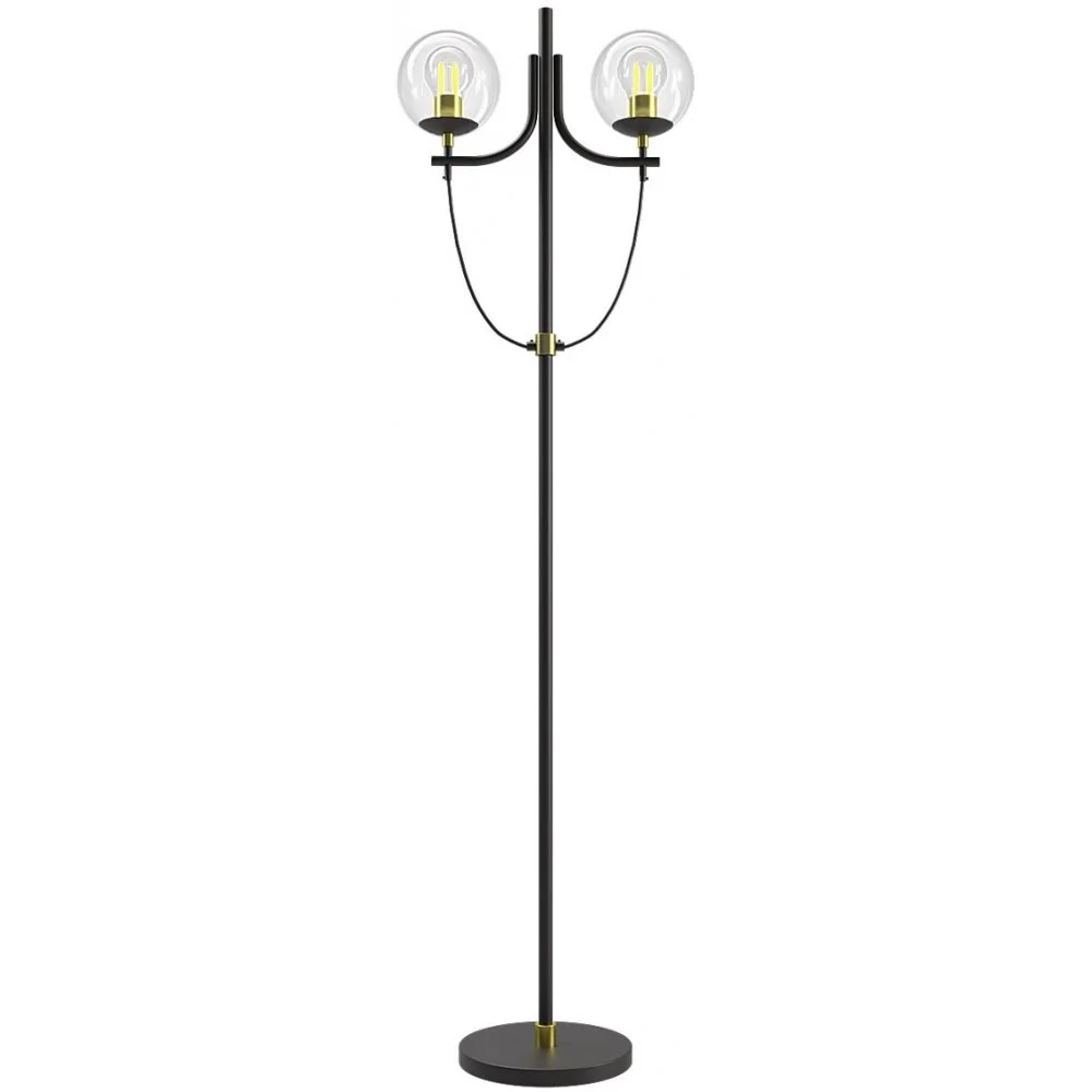 Glaslykta golvlampa i svart metall med klarglasbollar och mässingsdetaljer.