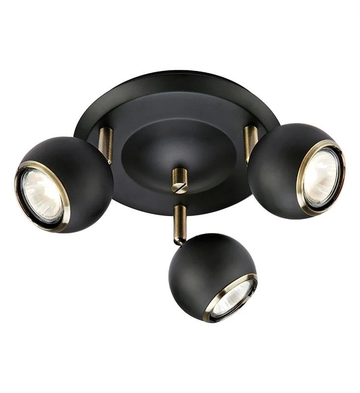 Coco härliga taklampa med en stilren design. Tillverkad i svart metall med ställbara lamphuvud och detaljer i antik mässing. Ljuskälla GU10, 3 st. Max 35W styrka i halogen. Lampan monteras lätt på plats och passar perfekt in på flera olika platser i hushållet.