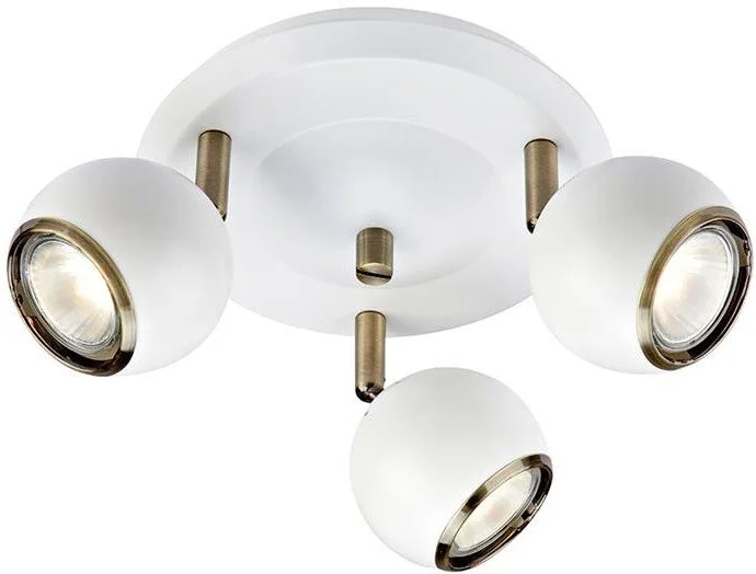 Coco härliga taklampa med en stilren design. Tillverkad i vit metall med ställbara lamphuvud och detaljer i antik mässing. Ljuskälla GU10, 3 st. Max 35W styrka i halogen. Lampan är lättplacerad och passar perfekt in på flera olika platser i hushållet.