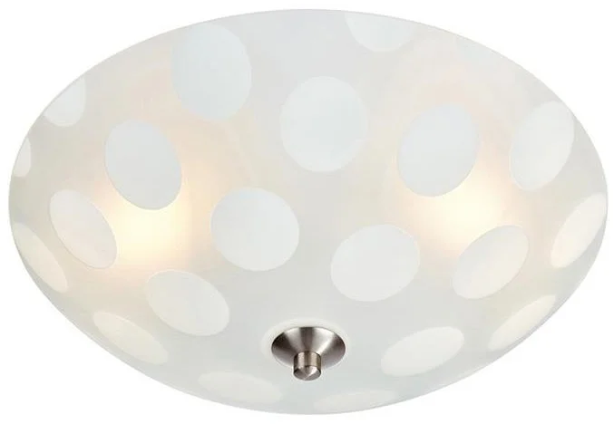 Dots stilren takplafond i glas. Vitt mönstrat glas med detaljer i stål. 35 cm i diameter. Upphäng för takkrok. 2st små (E14) lamphållare för max 2x 40W glödljus eller motsvarande styrka i lågenergi, halogen eller LED. Ojordad takkontakt medföljer.