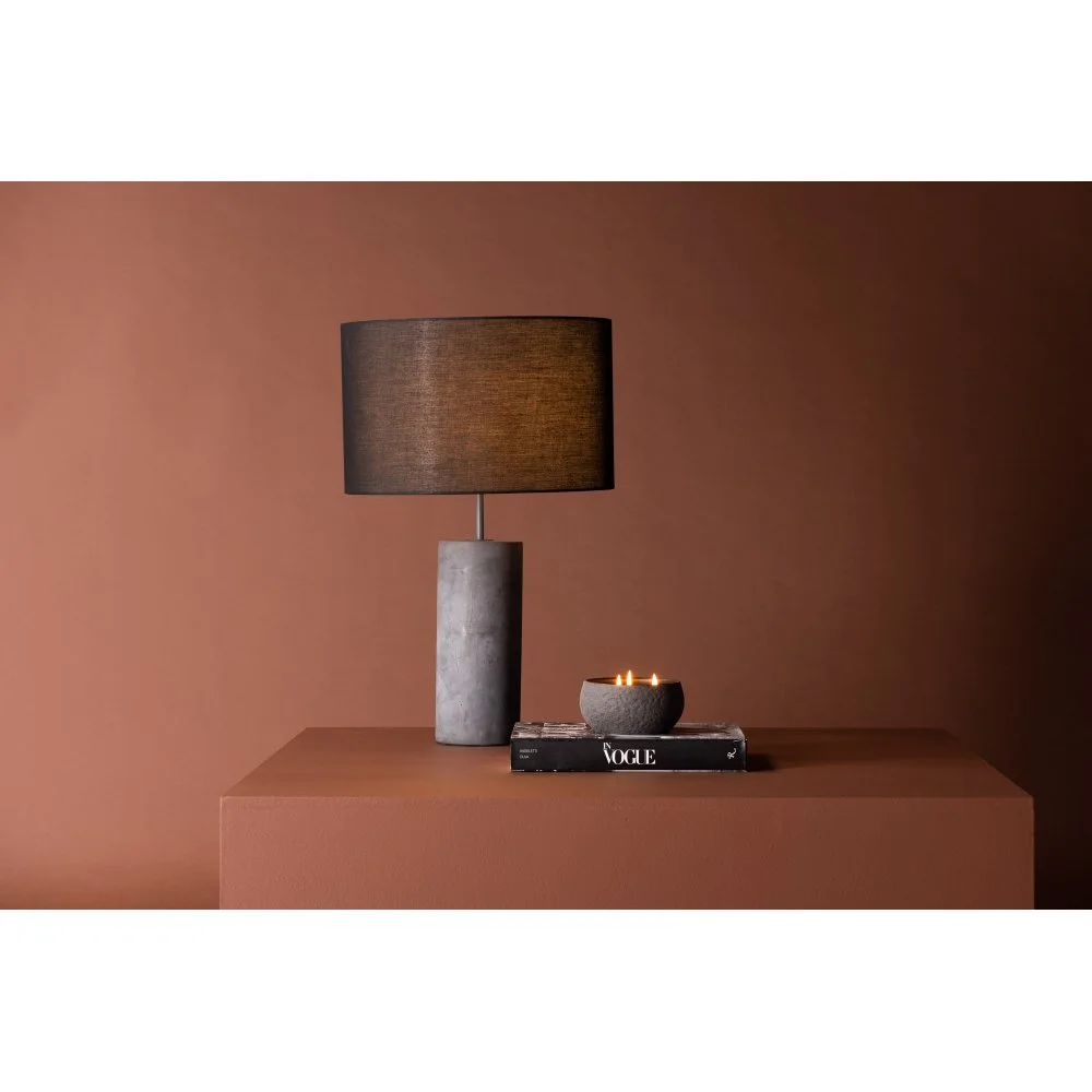Med denna bordslampa får du en kaxig inredningsdetalj som står sig över tid. Lampan har en modern design med en fot i grå betong och en lampskärm i svart linnetyg. Den generösa storleken och genomtänkta designen gör att lampan fungerar både som praktisk ljuskälla och trendig dekoration. Använd som fönsterlampa eller placera på en synlig plats för att höja stilnivån i hemmet.