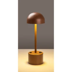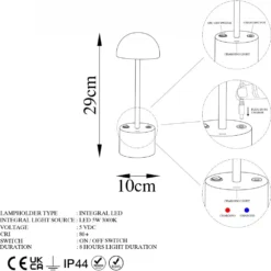 Bordslampa av metall. Kan användas som vanlig nätansluten lampa men kan även användas trådlöst. Full laddning (ca 5 h) ger 8 timmars batteridrift. Ljuskällan är integrerad i lampan och kan inte bytas ut.