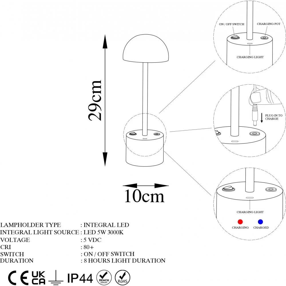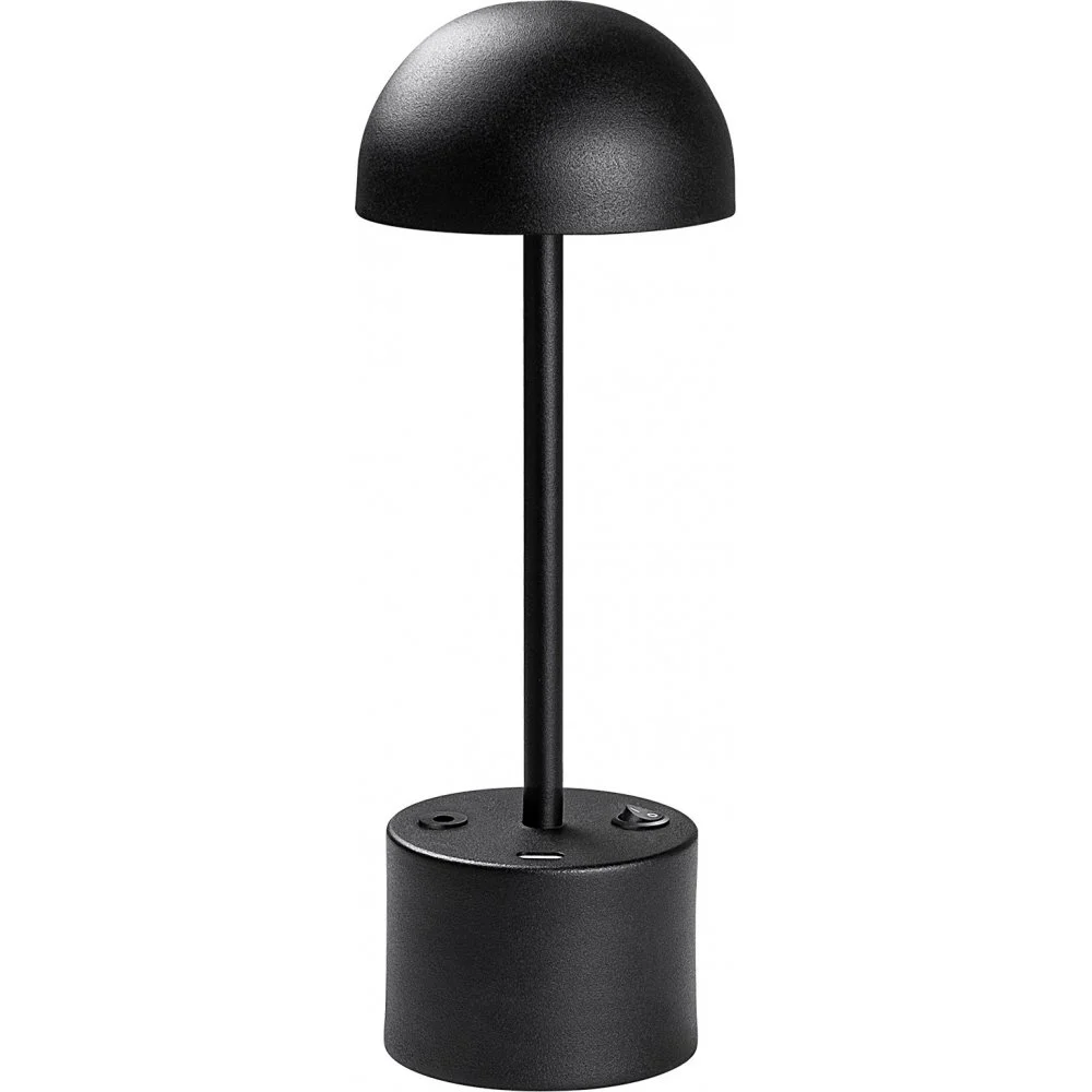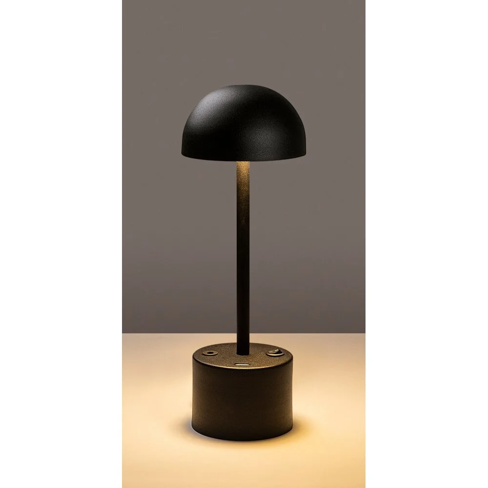 Bordslampa av metall. Kan användas som vanlig nätansluten lampa men kan även användas trådlöst. Full laddning (ca 5 h) ger 8 timmars batteridrift. Ljuskällan är integrerad i lampan och kan inte bytas ut.