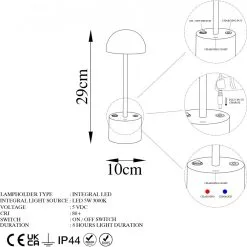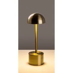Bordslampa av metall. Kan användas som vanlig nätansluten lampa men kan även användas trådlöst. Full laddning (ca 5 h) ger 8 timmars batteridrift. Ljuskällan är integrerad i lampan och kan inte bytas ut.