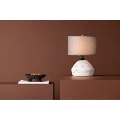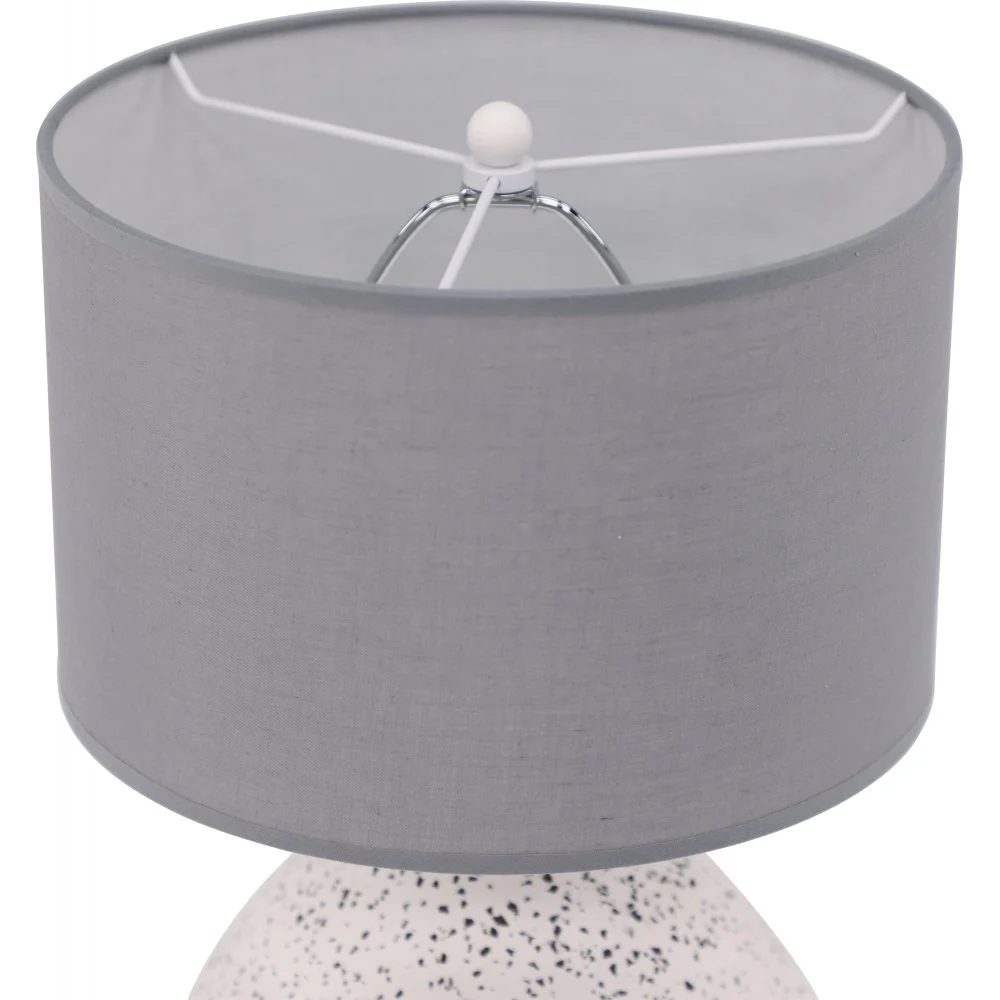 Bordslampa som kombinerar den rustika lampfoten i terrazzo med den mjuka lampskärmen i linne. De stilrena färgerna vitt, grått och svart gör att lampan enkelt matchar med annan inredning och faller många i smaken. Lampan kan placeras i hemmets alla rum, förslagsvis på sängbordet eller på en byrå i vardagsrummet.