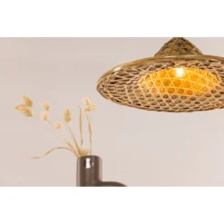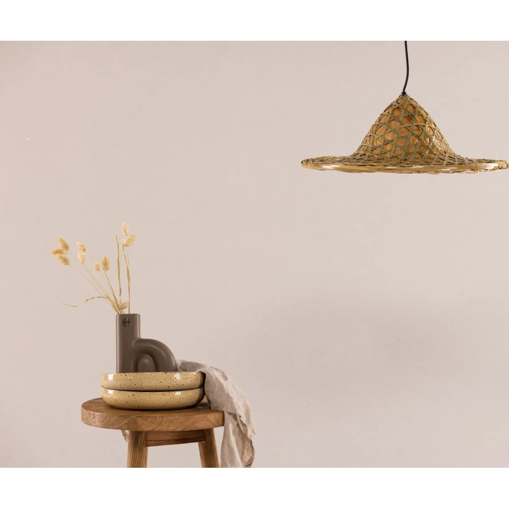 Taklampa av roting med en rund design med ett högre parti i mitten. Den nätta storleken och jordnära färgerna gör att lampan passar i de flesta rum och inredningsstilar. Denna lampan gör varje rum unikt och blir ett vackert tillskott till inredningen. Placera i sovrummet, över matbordet eller i vardagsrummet.