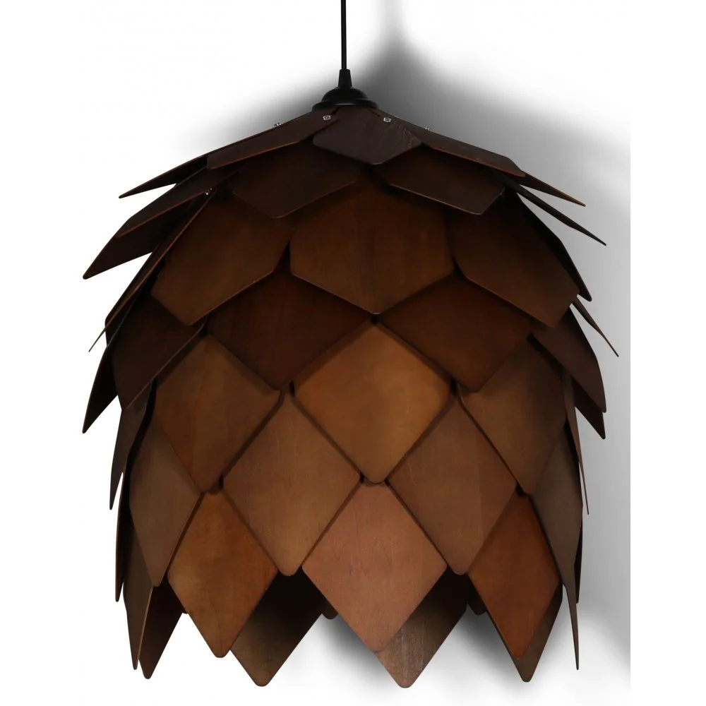 Taklampa Frost gjord i valnötsbetsade trälammeller.