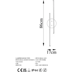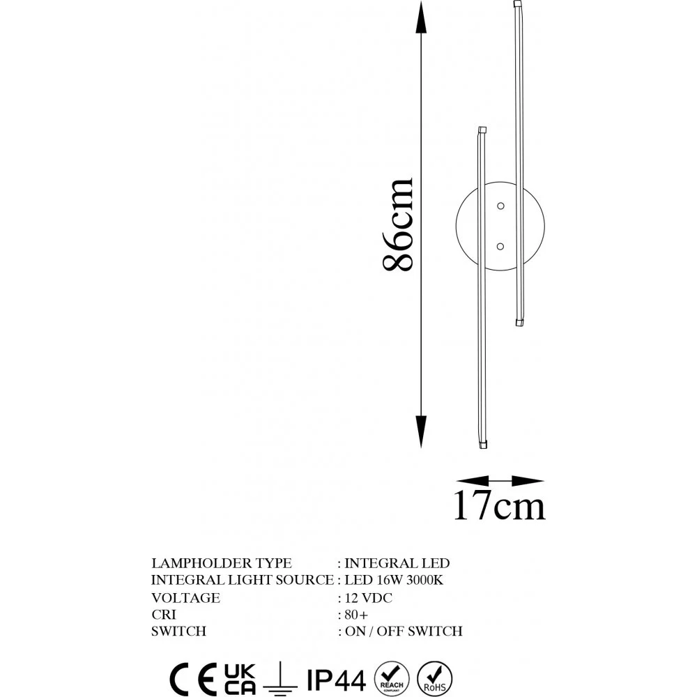 Vägglampa av metall. Ljuskällan är integrerad i lampan och kan inte bytas ut.
